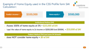 Some colleges use an institutional method to determine financial need awarded by that school, and they use the College Board’s CSS Profile application. On the CSS Profile, families are asked to provide details to determine the home equity value of their primary residence. These colleges want a more complete picture of a family’s financial status.